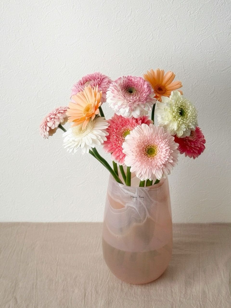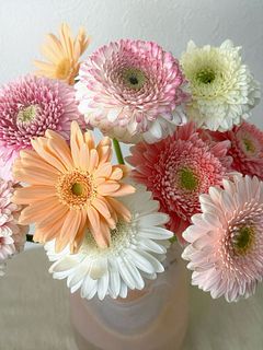 アプリコットピンクやコーラルピンク、ホワイトピンクなどニュアンスカラーのガーベラをギュッと束ねました🍑ころんとした咲き方が最高にキュート。