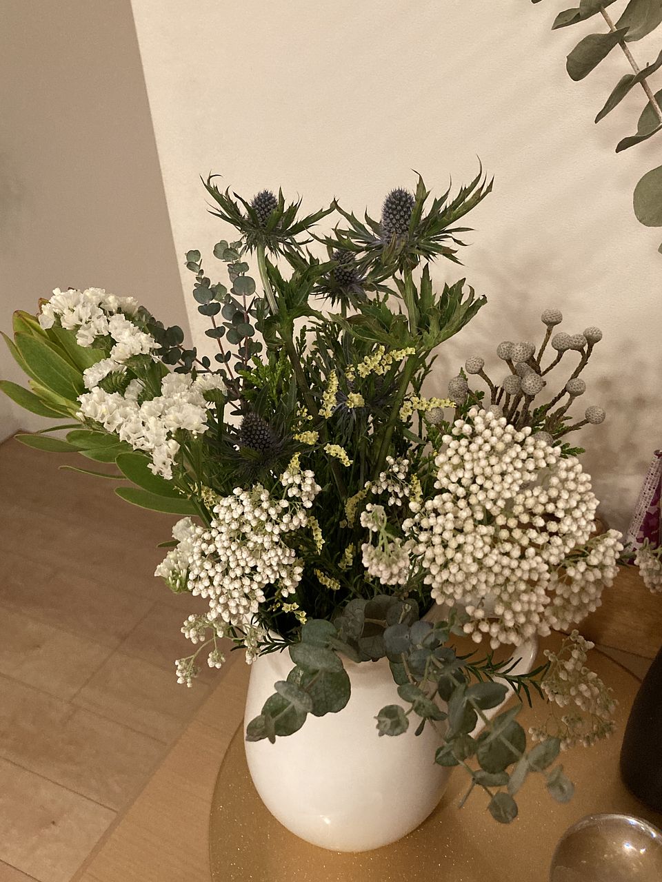ヒバなど深い森の香りが楽しめるグリーンと、エリンジウムなど涼しげな花を合わせました。