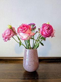 古典的な吹きガラスの製法で、職人の手によってひとつひとつ丁寧に仕上げられています。愛らしいぽってりとしたフォルムとくすみカラーのミルキーピンクのカラーリングがおしゃれ🎀