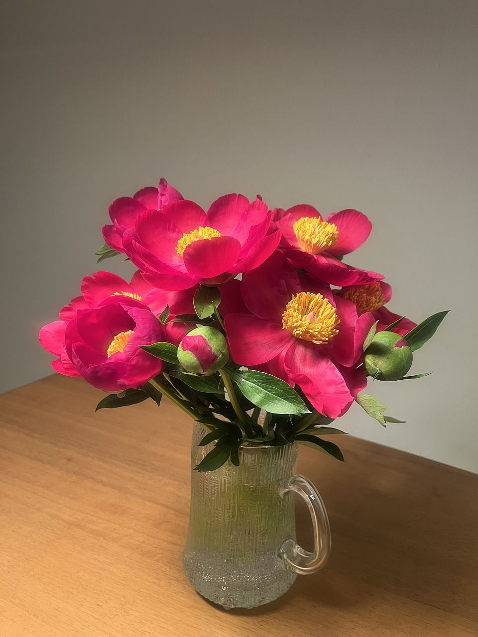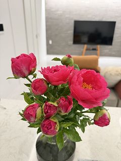 鮮やかな濃いピンクの芍薬が届きました♪ とても綺麗です✨ 直ぐに水切りをして花瓶に入れてあげたら蕾が開いて来ました♪ 他の蕾が開くのも楽しみです😊