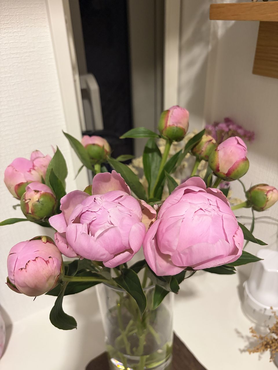 白の芍薬があるので、白以外ならいいなぁーと 思っていたら、ピンクでした。咲いてるのもありましたが、家の白芍薬も半分咲いています。 蕾から花咲くまで長く楽しめます。 芍薬が1番好き。暑くなってくるとお花がなかなかもたないから、今後どうしようかな、とは思っております。