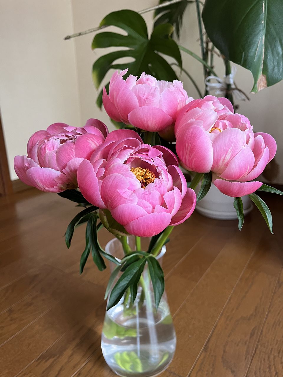 半八重咲きのコーラルカラーの芍薬🧡「コーラルチャーム」または「コーラルサンセット」、「ピンクハワイアンコーラル」からおまかせで4本お届けします。