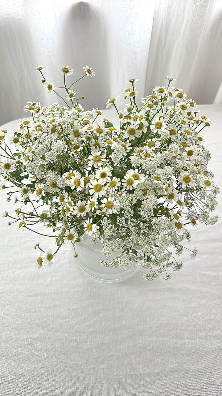 ふわふわゆれるマトリカリア「シングルペグモ」と「ホワイトレースフラワー」をたっぷり束ねました💐