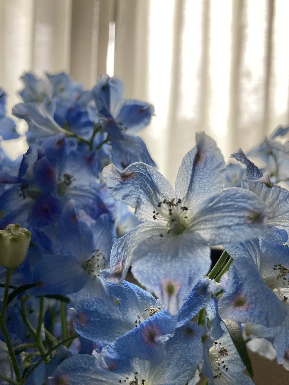 デルフィニウムの名前は咲く前のつぼみの形がイルカに似ていることから、ギリシャ語でイルカを意味する「delphis」が由来🐬