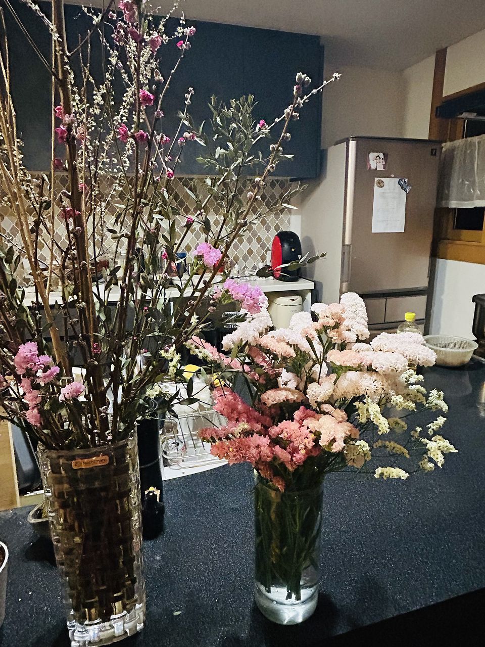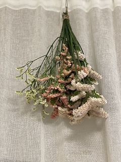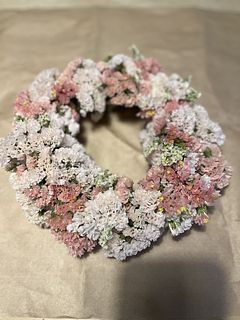 花瓶に生けてしばらく愛でたあと、去年から 何度か注文しているスターチスのリースを真似て 100均のリース台でニュアンスカラーのリースを 作りました♡可愛い♡