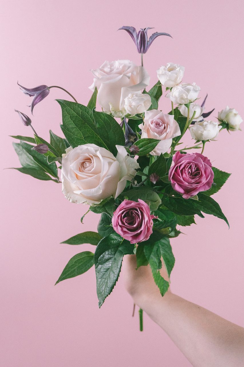 クレマチス3本、バラ5〜6本でお届けします。
