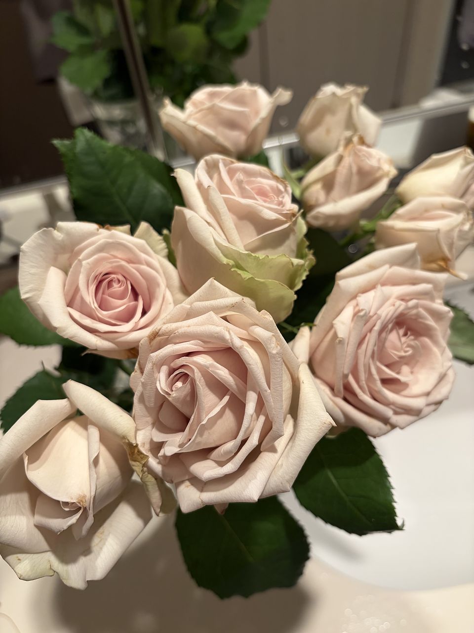 花びらが、咲いていくにつれて、薄いグリーンから、ベビーピンク🩷にかわり、優しい香りのする薔薇🌹で、可憐で可愛らしいです。 10本飾って豪華に飾ったあと、 5本づつ2種類の花瓶にわけて、雰囲気を替えて飾って、たのしませていただいています。