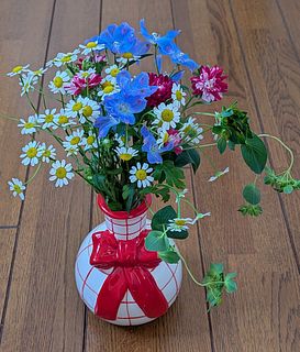 白い花の花弁が折れ痛んでいて、水揚げしても復活しなかった。ミモザの下半分が茶色く変色していた。以上によりボリュームが少なく見栄えが悪くなり、葉物を別途購入して整えた。