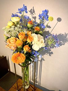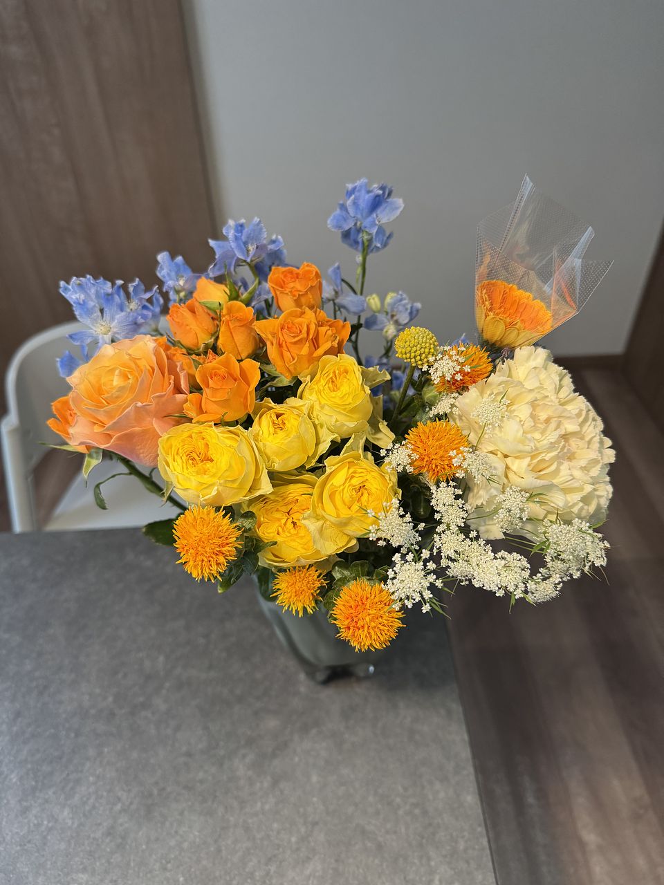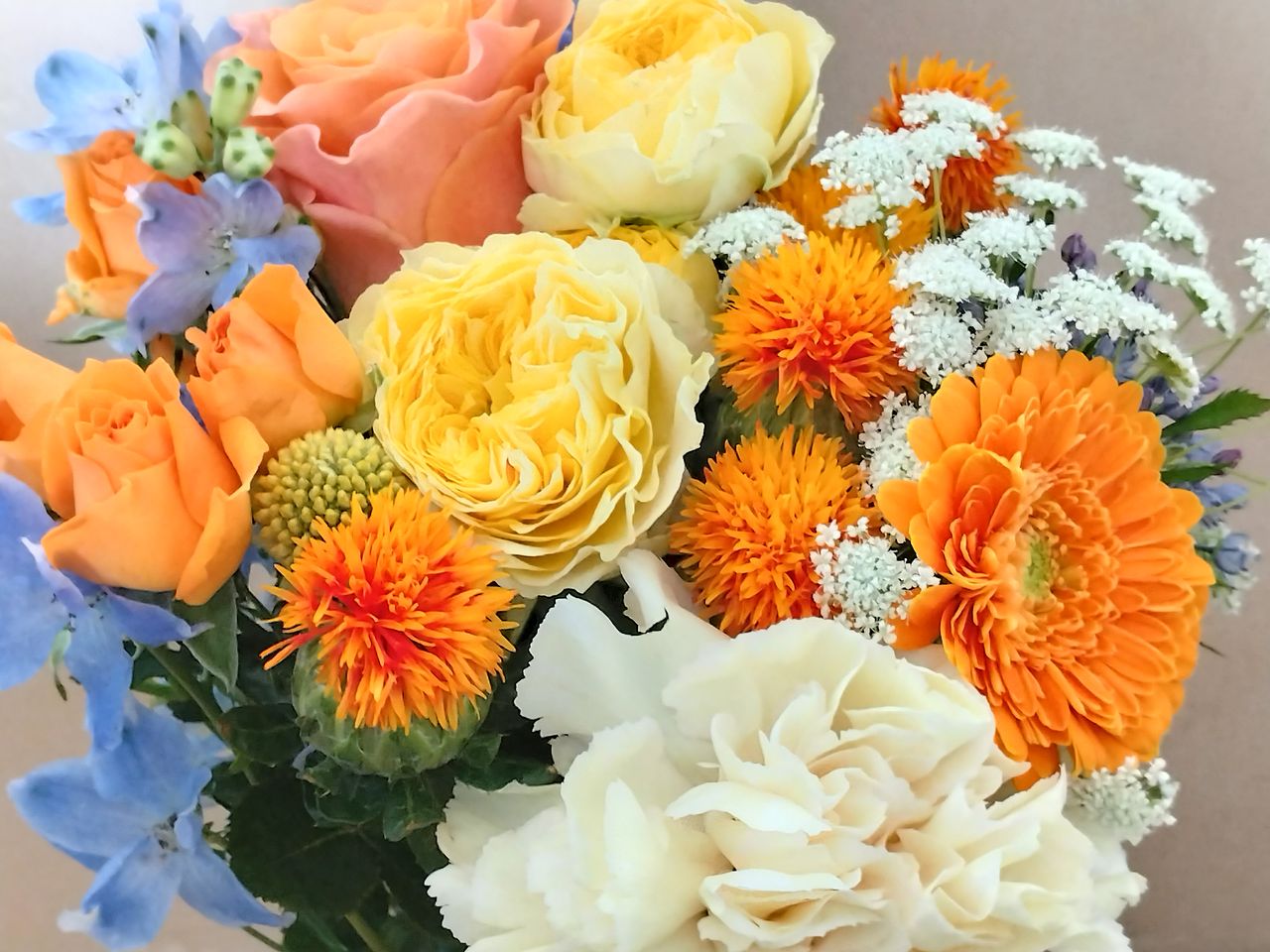 紅花がキレイだし、あまり見ないのでよかったです。あとは、オレンジと黄色バラ、オレンジのガーベラ、ピンクカーネーション、デルフィニウム(ブルーと薄いブルー)、アリウム・カエルレウム。彩りキレイです。花の外側が少し傷が入っていたりしますが、取れば問題なし。