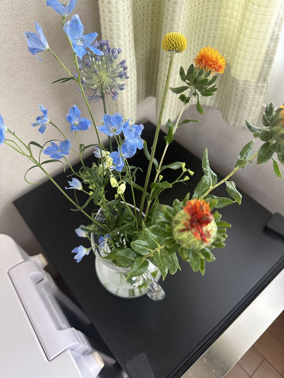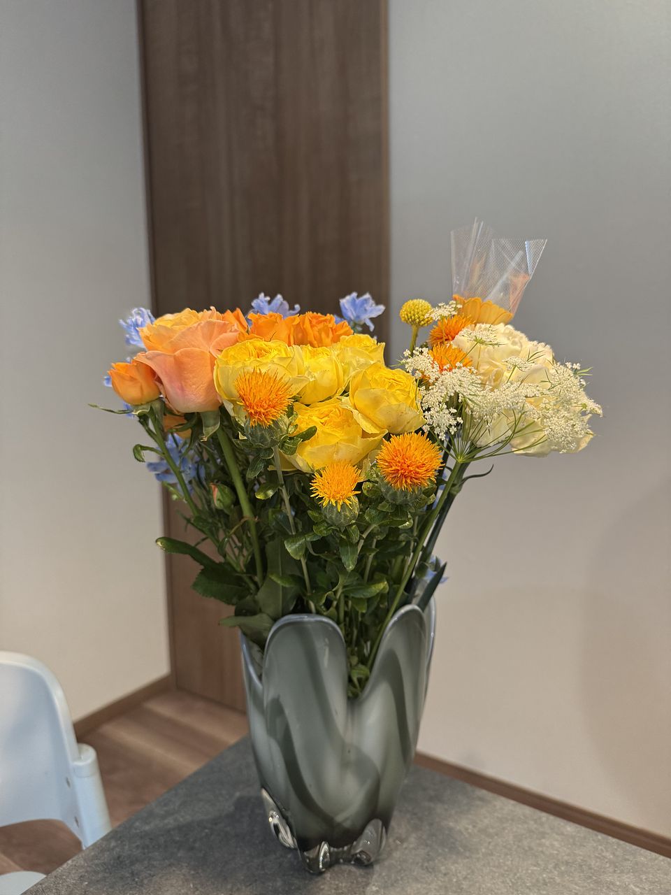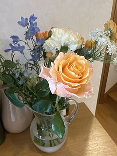 半分にして半分は義母にあげようと思い、近所の花屋でデルフィニウムと白いバラを買い足したら、白いバラが大きすぎて、そっちが主役になってしまいました、、、☺