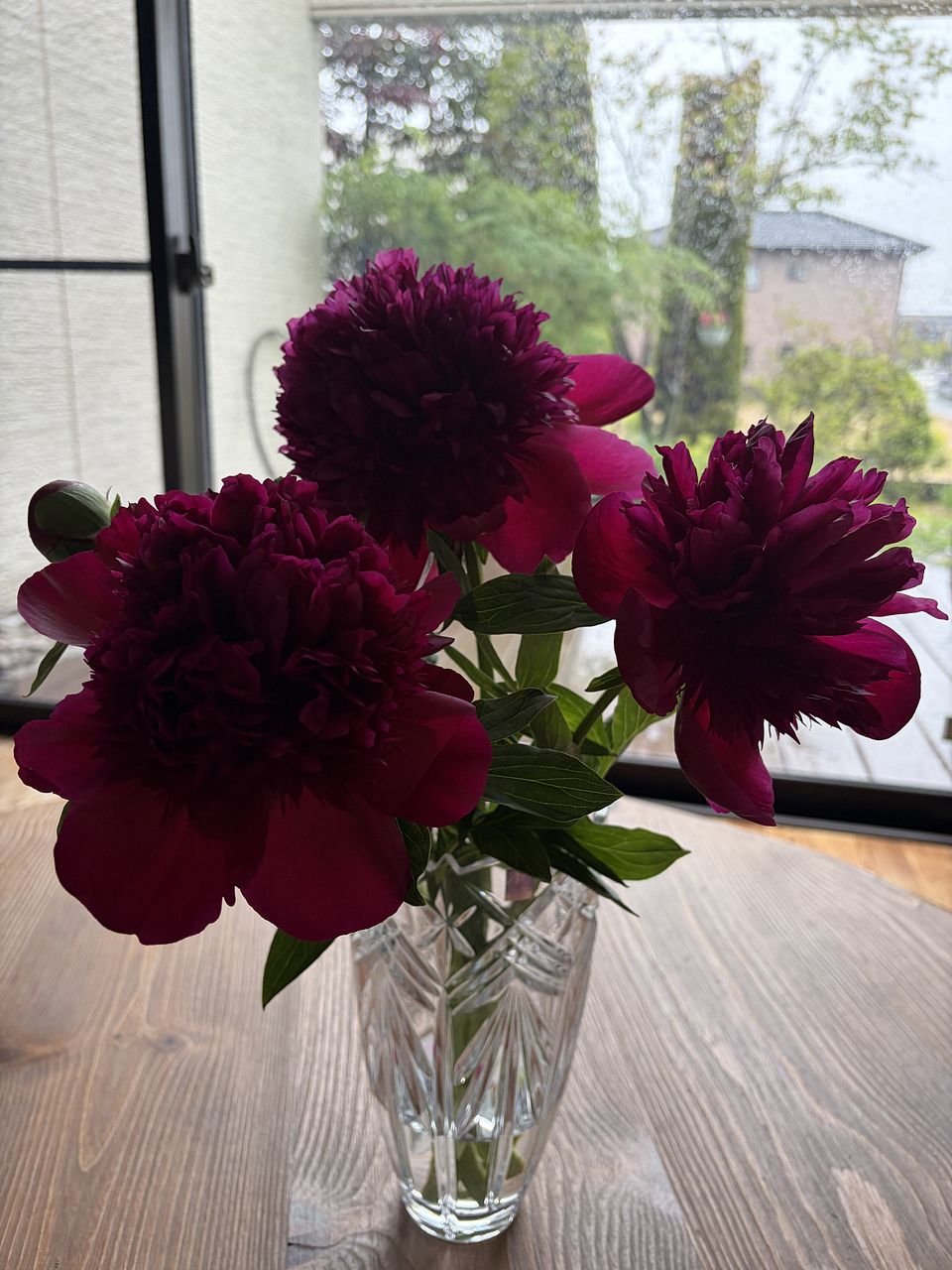 鮮やかなバーガンディの芍薬💖早速レッスン室に飾りました‼️お部屋が明るいオーラに包まれてます💗