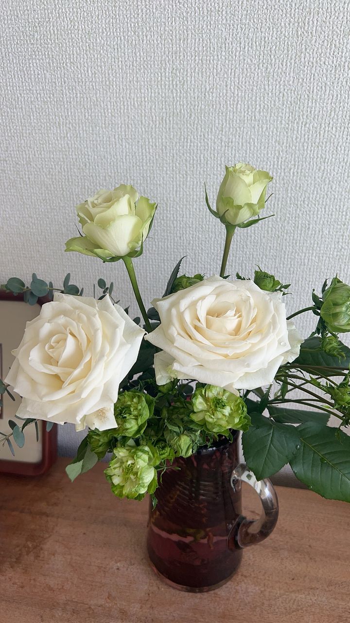 白バラの上品さに、グリーンの軽やかさを合わせた、すっきりとした印象✨