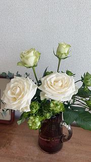 ホワイトとグリーンのバラを束ねた、ローズアソートブーケ。