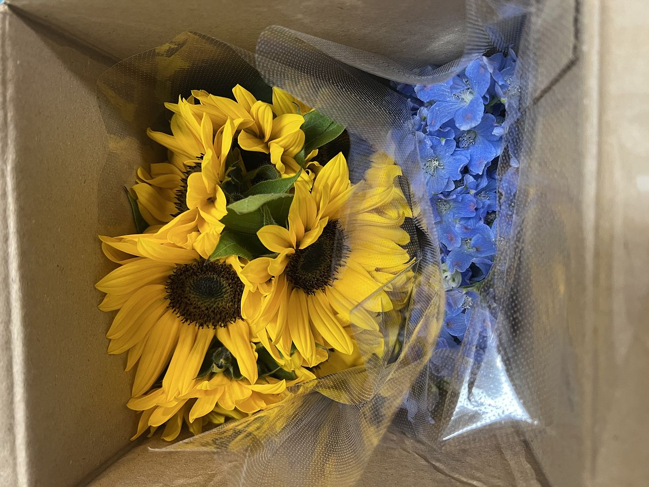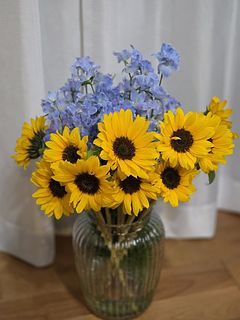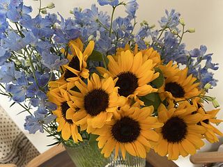 ひまわりは10本、小さめのお花でとってもかわいいです。デルフィニウムはボリュームたっぷりで 写真の3倍はありました。 この組み合わせ最高です!
