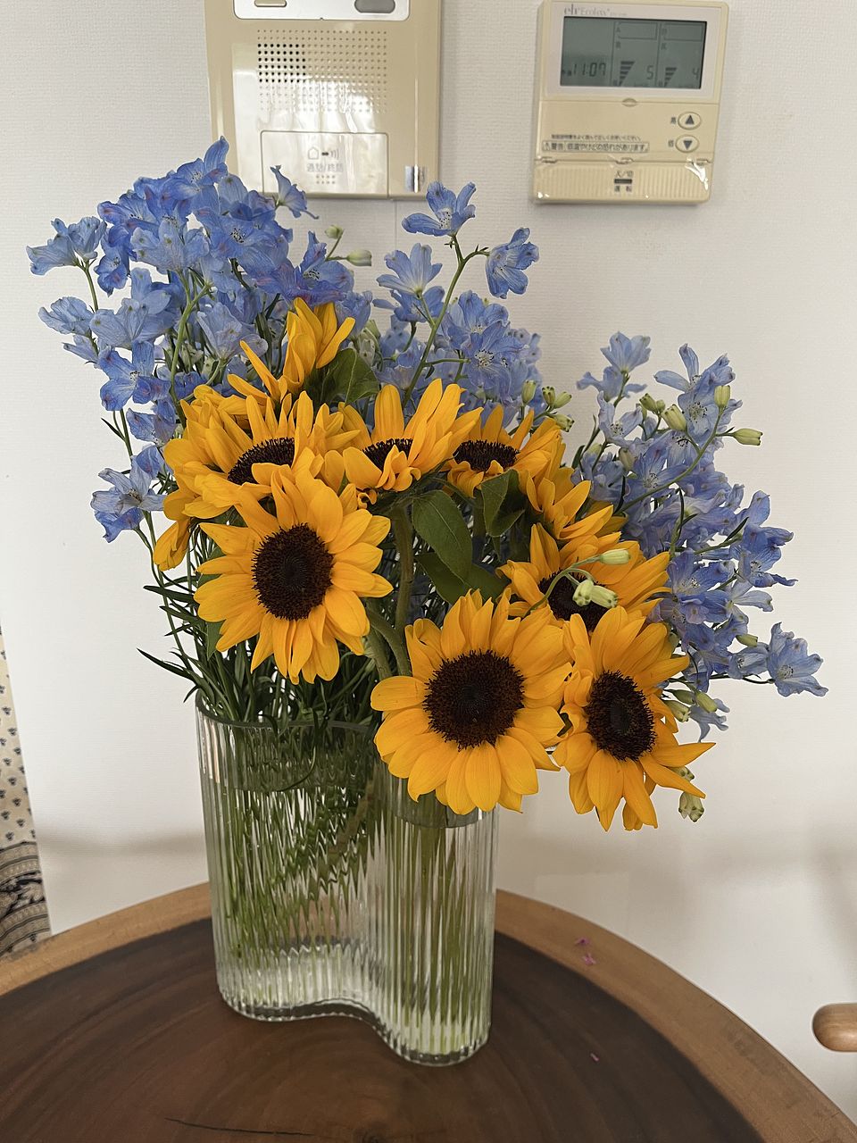 とっても元気なお花が届きました。 ひまわりとデルフィニウムのイエローとブルーの組み合わせが素敵です。