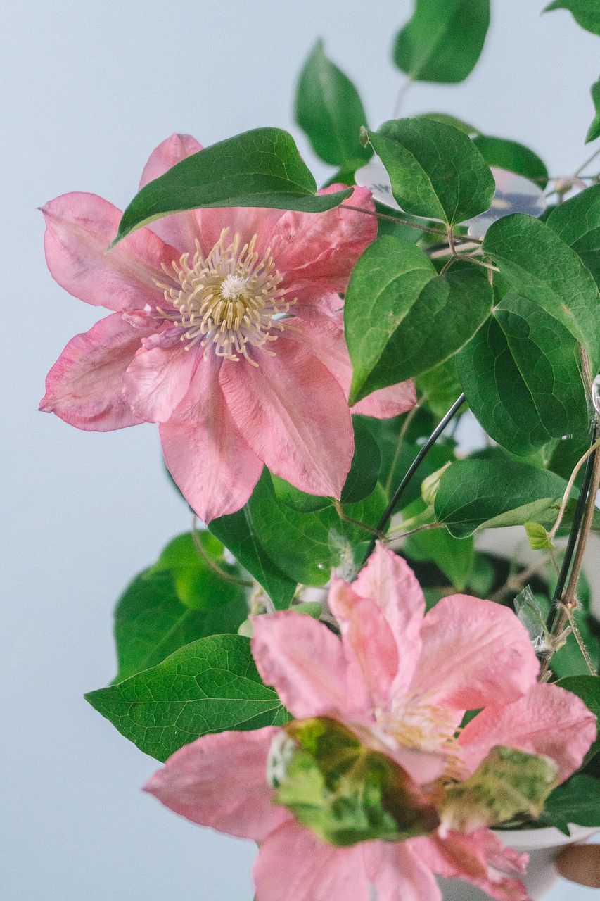 中心に向かってほんのり深まる色合いが、可憐さの中に少しの華やかさをプラス。つるを伸ばしながら咲く姿も軽やかで、空間に動きを与えてくれます。