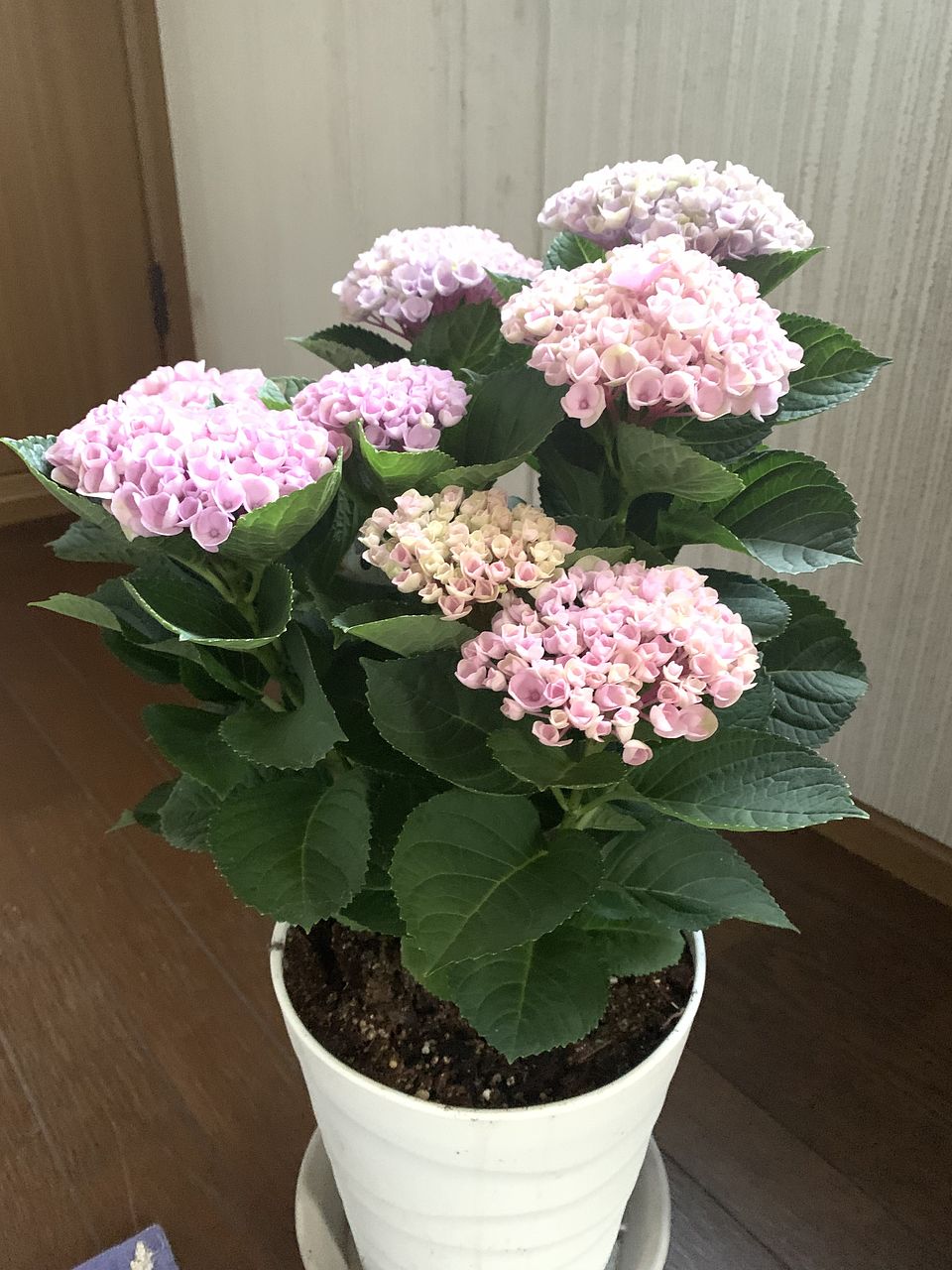 一つの鉢でいろいろなカラーを楽しめる紫陽花なので、箱を開けた瞬間うわーとなりました。 とても素敵です。 早速玄関の一番見てもらえるところに置きました。