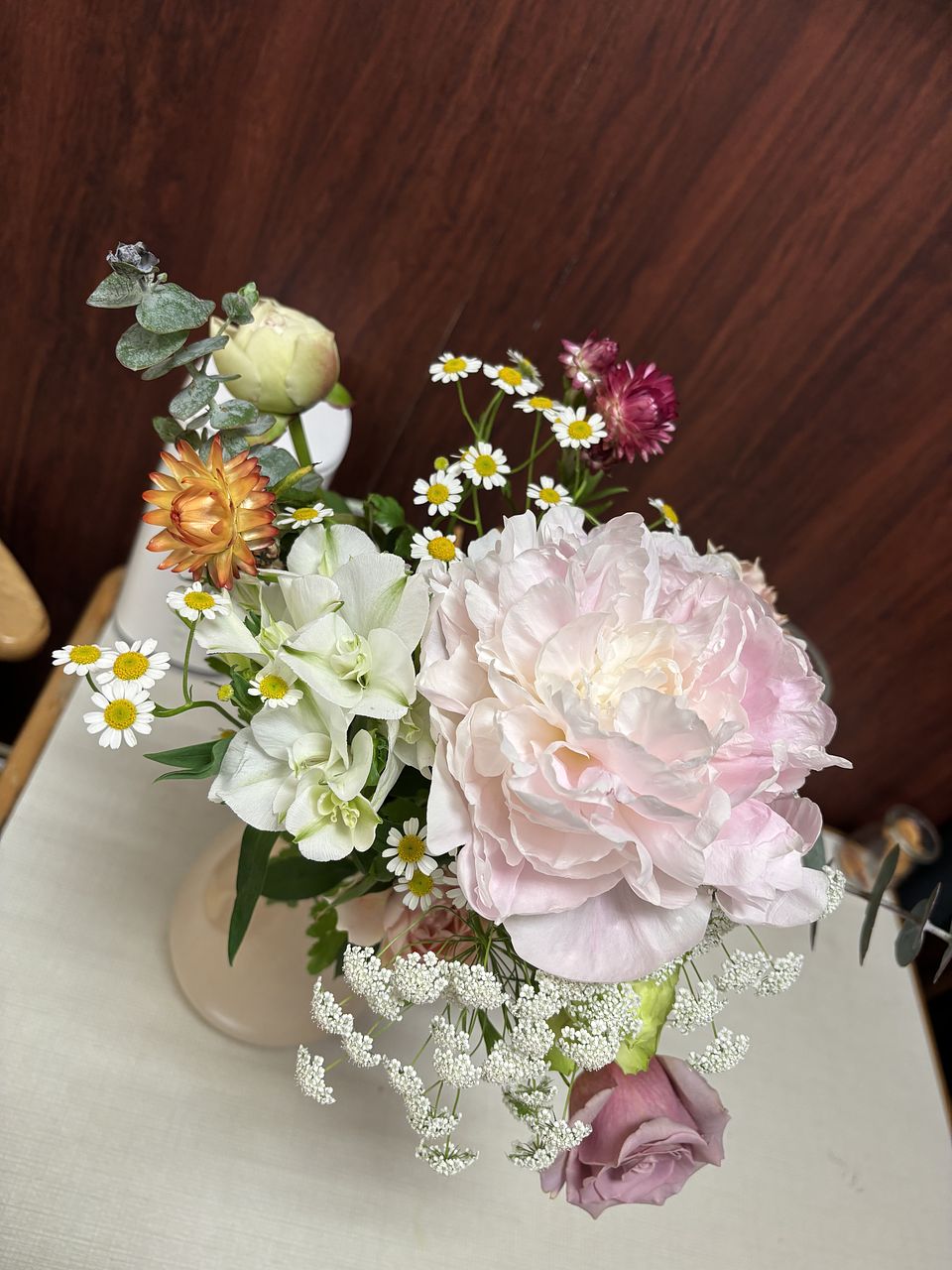 優美な芍薬を中心に、バラや草花がふんわりと咲くナチュラルなブーケ。