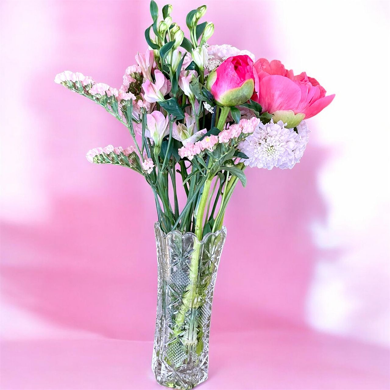 キュートないちごみるくのようなカラーのお花を束ねました🍓🥛
