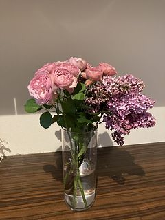 ライラックの花言葉は「恋の芽生え」。紫色のバラは「気品」「尊敬」。