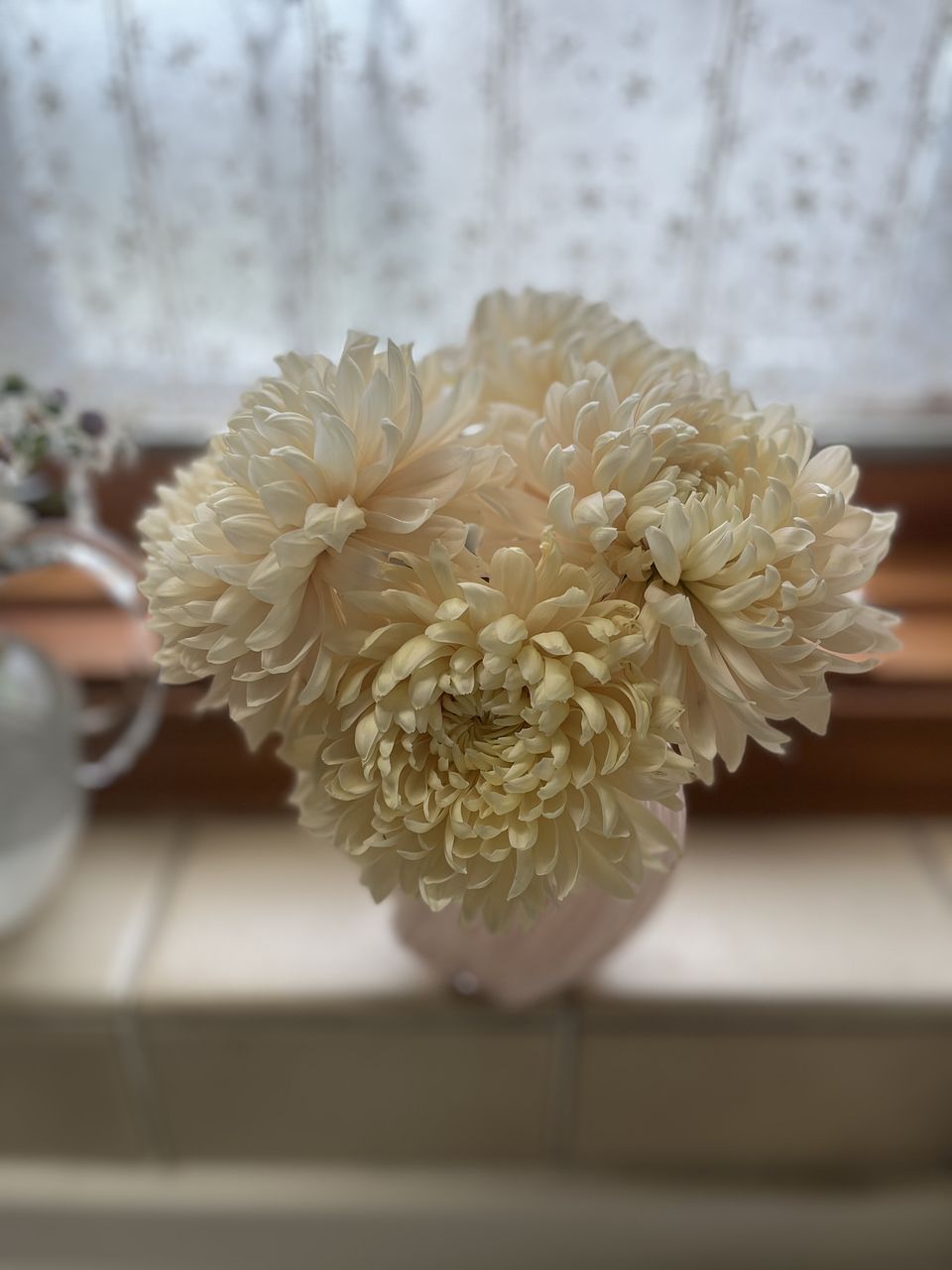 ふわふわな姿がたまらない。ミルキーベージュの大輪マム「シルキーガール」。