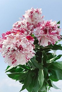 いちごみるくのようなカラーリングが美味しそう🍓珍しいマーブルカラーの芍薬です。開花が早い品種のため、咲いてる状態でお届けします。