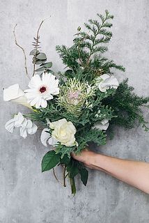 ホワイトとゴールドの華やかなブーケ。愛らしいガーベラは「スヌーピー」という品種をセレクト。ボリューミーな葉牡丹は、真ん中がほんのりピンクに。花言葉は「祝福」。背筋がすっと伸びるような雰囲気のあるブーケです。