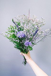 ふわふわ小花がかわいいラベンダーカラーのスターチスとヒバを束ねて💜