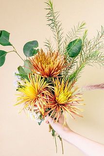 変わり咲きのアンティークオレンジのマムが主役のブーケはいかが?