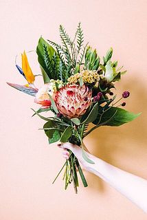 リゾート気分を楽しむブーケ🦜「ストレリチア」は、極楽鳥に似ていることから極楽鳥花とも呼ばれています。存在感たっぷりのプロテアはふわふわな質感が不思議。大きなバラは「ケンジントンガーデン」をセレクト。