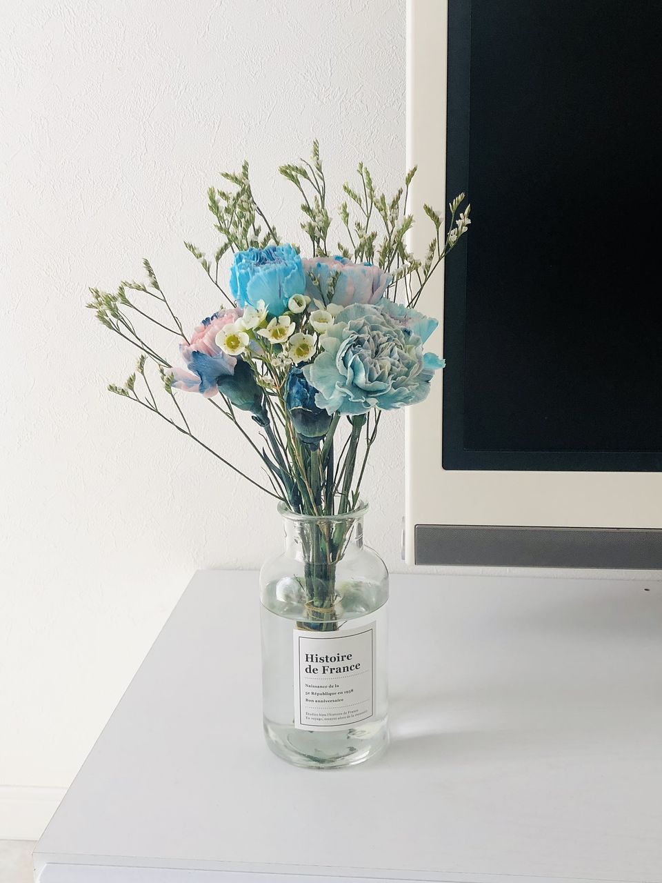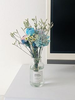 めずらしいブルーのワックスフラワーを使ってデニムの青をイメージしたブーケを作りました。カーネーション「コバルトブルー」やバラ「アヴァランチェブルー」を組み合わせて。涼しげなカラーをお部屋に飾りませんか?バラやカーネーションは染色しているため、水の色が青くなることも。染色剤が手に付いてしまったら、石鹸で洗うと落ちますのでご安心を。※カーネーションの色は写真と印象が異なることもあります。ご了承ください。