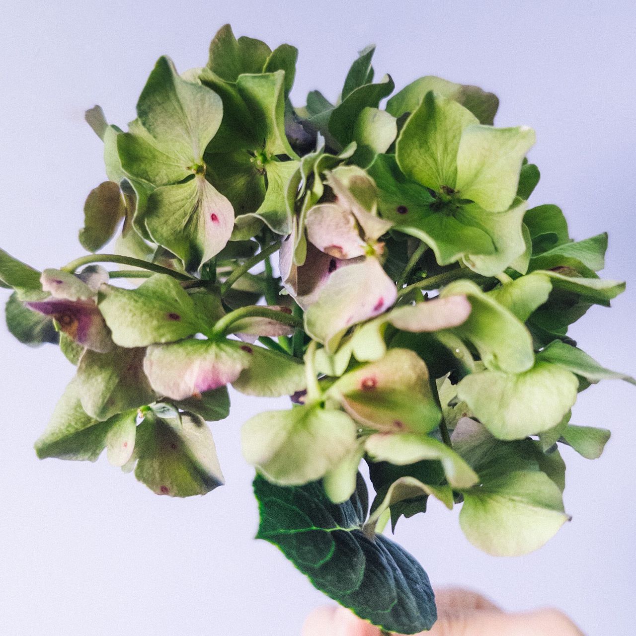 - お花がくたっとしている場合は、紫陽花を丸ごと水につけてみて。洗面台のボウルにたっぷり水を貯めて、紫陽花を浮かべるだけ。ガクや葉っぱから水を吸う特性があるので、数時間後にはしゃきっとします。お花屋さんになった気分でお手入れしてみてください。