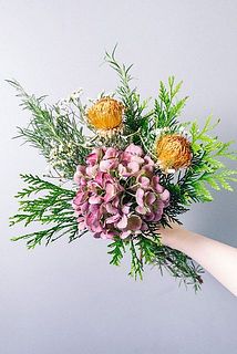アンティークカラーの紫陽花とドライアンドラを束ねて💐