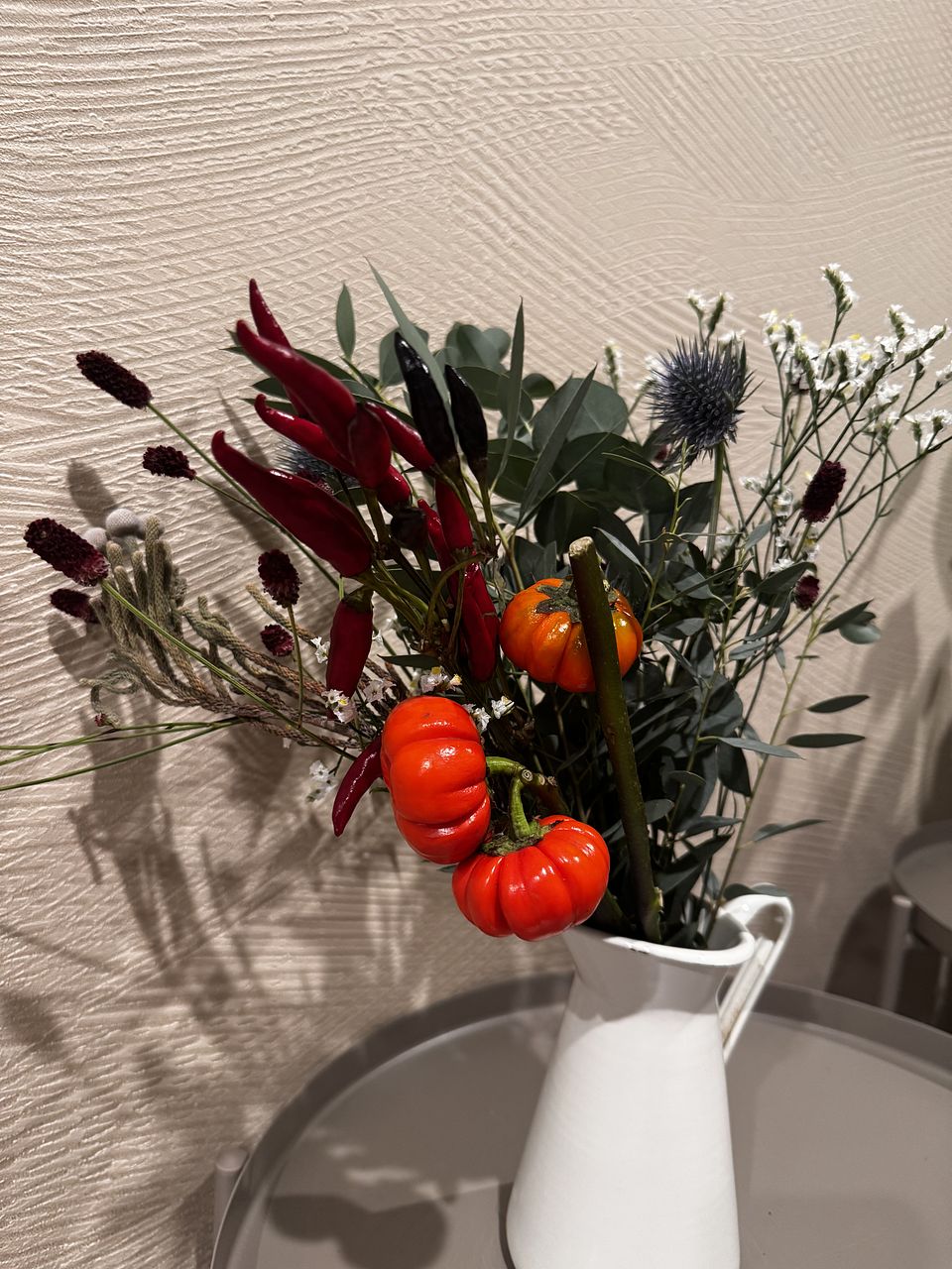 ちょっぴり早めのハロウィンブーケはいかが?パンプキンツリーを主役にエリンジウムやシンフォリカルポスをアクセントに。