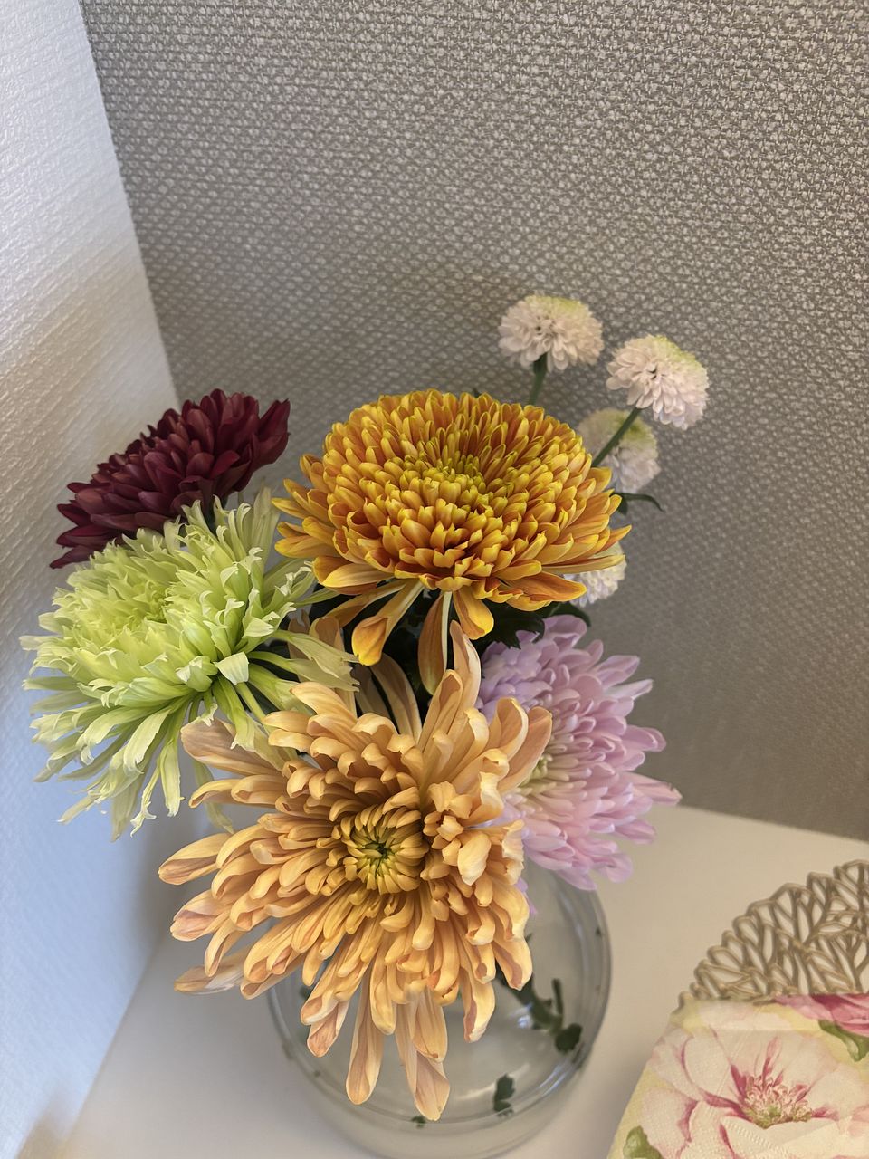 秋が旬のマムをお届け💐お供えのイメージが強いマムですが、スパイダー咲きやポンポン咲きなど、さまざまな咲き方や色合いがあります。花保ちの良さはダントツ。長く楽しめるお花です。どんな品種が届くかは箱を開けるまでのお楽しみ。