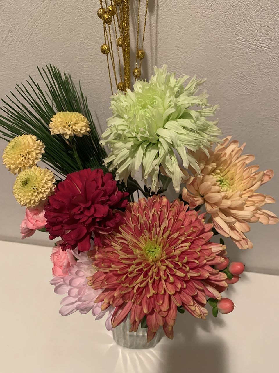 お供えに使いました。ちょっと変わったマムが、入っていて、お正月らしく 華やかになりました。 気に入ってます