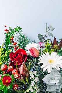 赤とホワイトのお花組み合わせたホリデーシーズンにぴったりのブーケはいかが?🎅