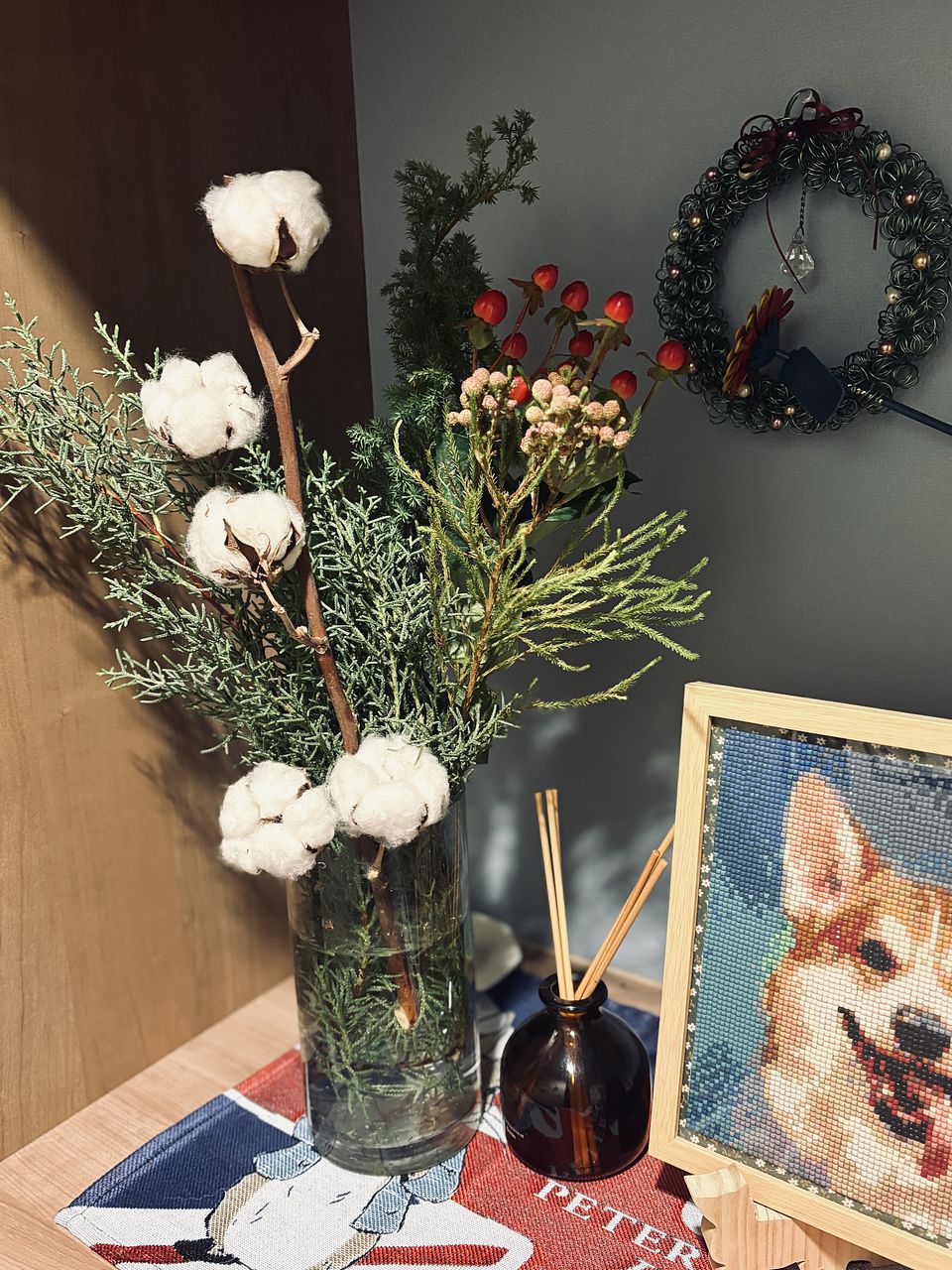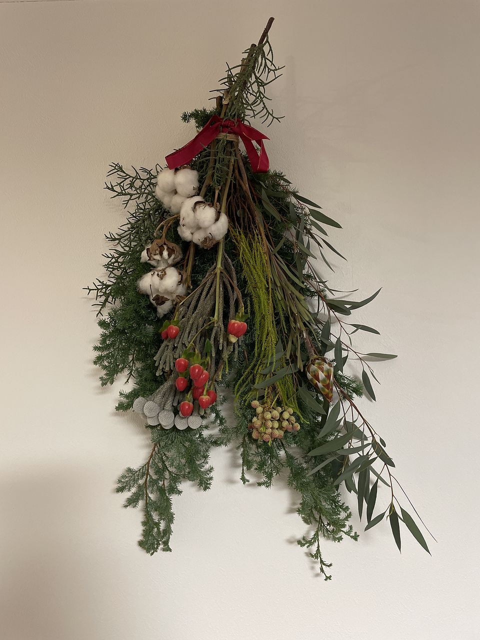 箱から出した時に良い香りが立ち込めて癒されました。初めて購入したので、どう飾ったら良いのか何が正しいのかわからないまま生けましたが、何とかクリスマスっぽくできたかな? 葉っぱが良い香りだったので、束ねてトイレに飾りました。 年末年始このまま楽しみたいと思います。 素敵なクリスマスになりそうです😊