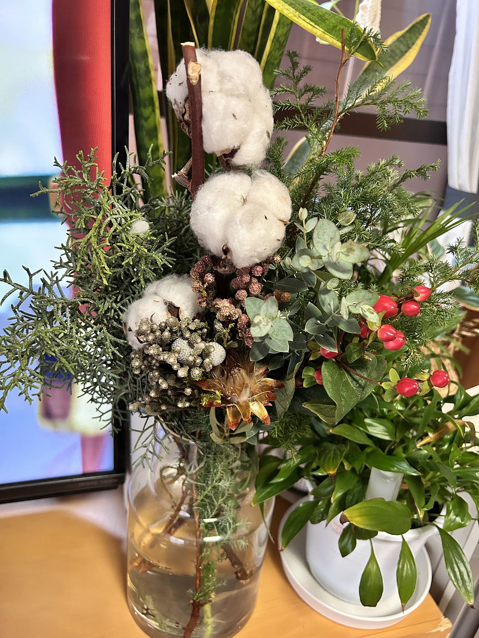 コットンとヒペリカムがアクセントになり、クリスマスらしい組み合わせでした🎄