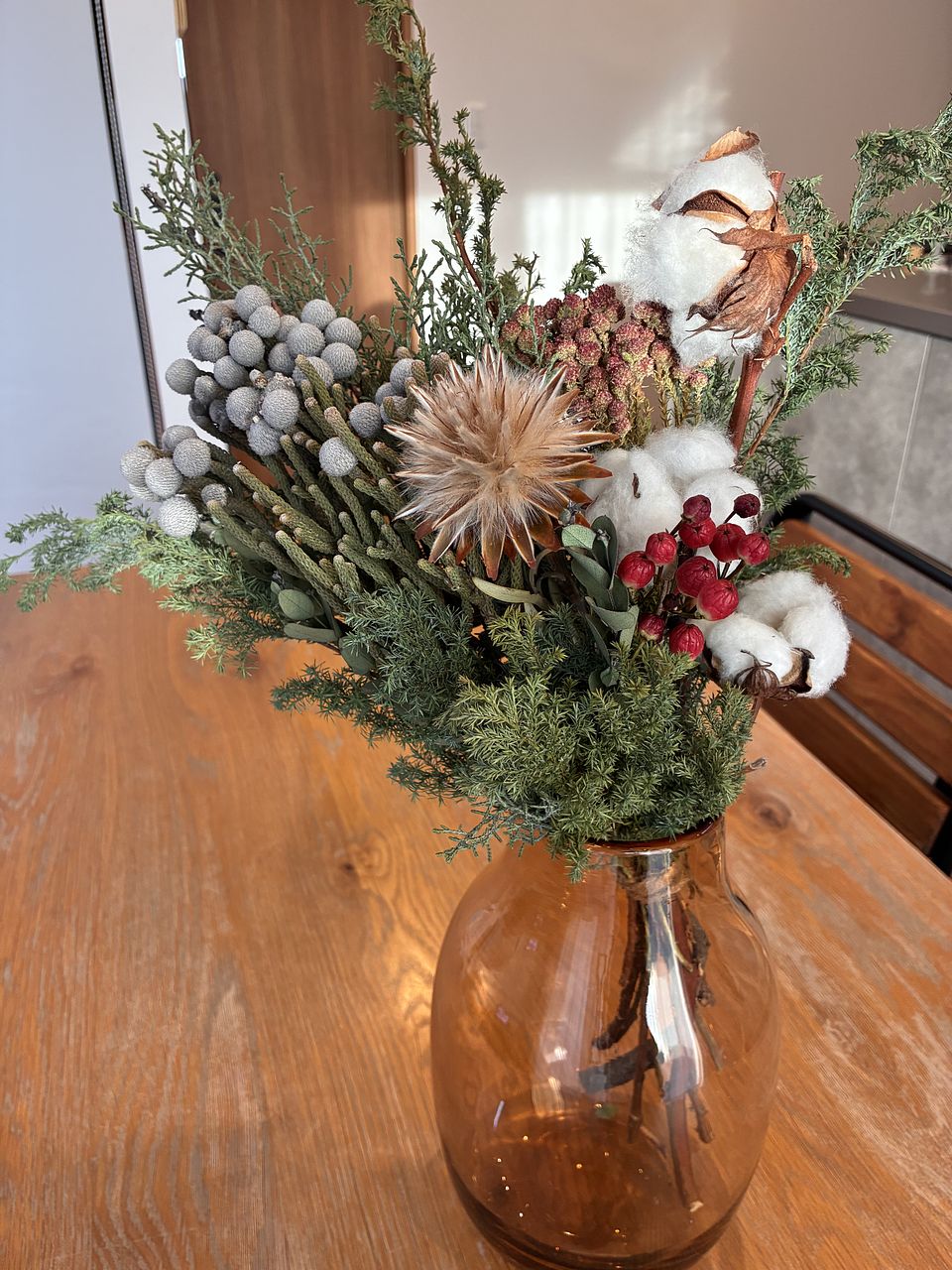 自分では選ばない花材で、とっても可愛いです。 クリスマスっぽい雰囲気で満足です。
