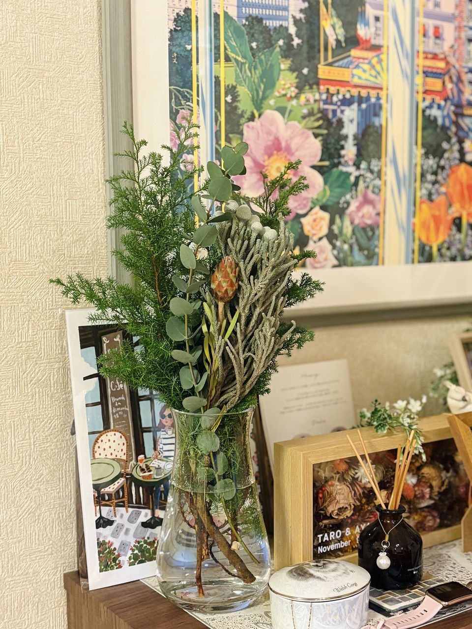 最初来た時は枝のボリュームが多くて...😟でしたが、いくつかの花瓶に分けていけてみたら可愛かったです💓 このボリュームなら友だちのクリスマスパーティーにもお裾分けで持っていけるし、そう考えるといい買い物をしました😙 ダイニングが一気に森の香りに包まれます🎄
